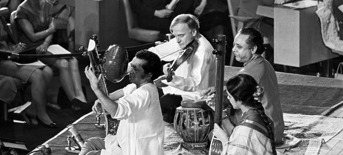 दिसम्बर 1967 में, संगीत की अलग-अलग परम्पराओं के दो महारथियों ने न्यूयॉर्क स्थित संयुक्त राष्ट्र महासभा हॉल में मंच को साझा किया. भारतीय सितार वादक पंडित रवि शंकर और ब्रिटिश-अमेरिकी वायलिन वादक येहूदी मेनुहिन ने जब विश्व नेताओं के समक्ष अपनी कला का प्रदर्शन किया, तो यूएन टीवी के कैमरे ने उस ऐतिहासिक पल को रिकॉर्ड कर लिया. यह मात्र एक संगीत प्रस्तुति नहीं थी, बल्कि सांस्कृतिक विरासतों के बीच एक आत्मिक सम्वाद भी था, जहाँ सुरों के ज़रिए एकता, सम्मान और शान्ति का सन्देश दिया गया. (वीडियो)